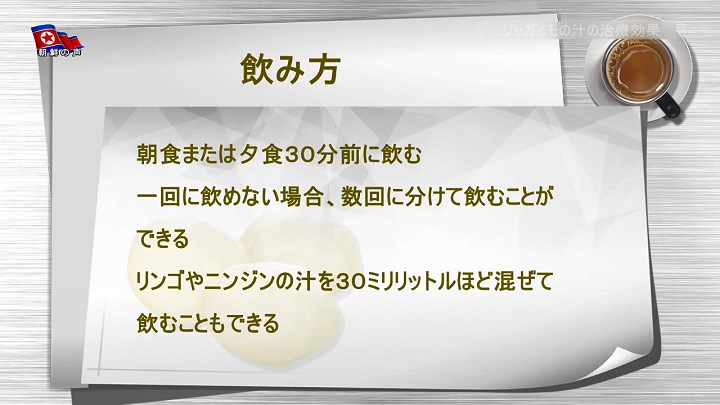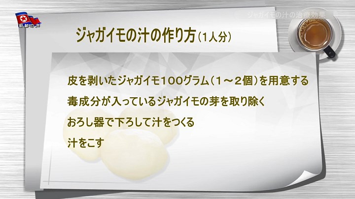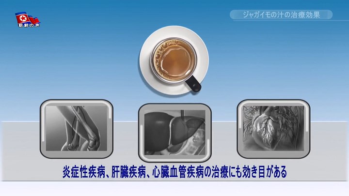 呉英淑(オ・ヨンスク):私達の生活の中には人の健康と長寿に良い食品が沢山あります。このような食品は時によって驚くほどの治療効果を現す事もあります。ではジャガイモの汁がどんな治療効果を現すか見てみましょう。