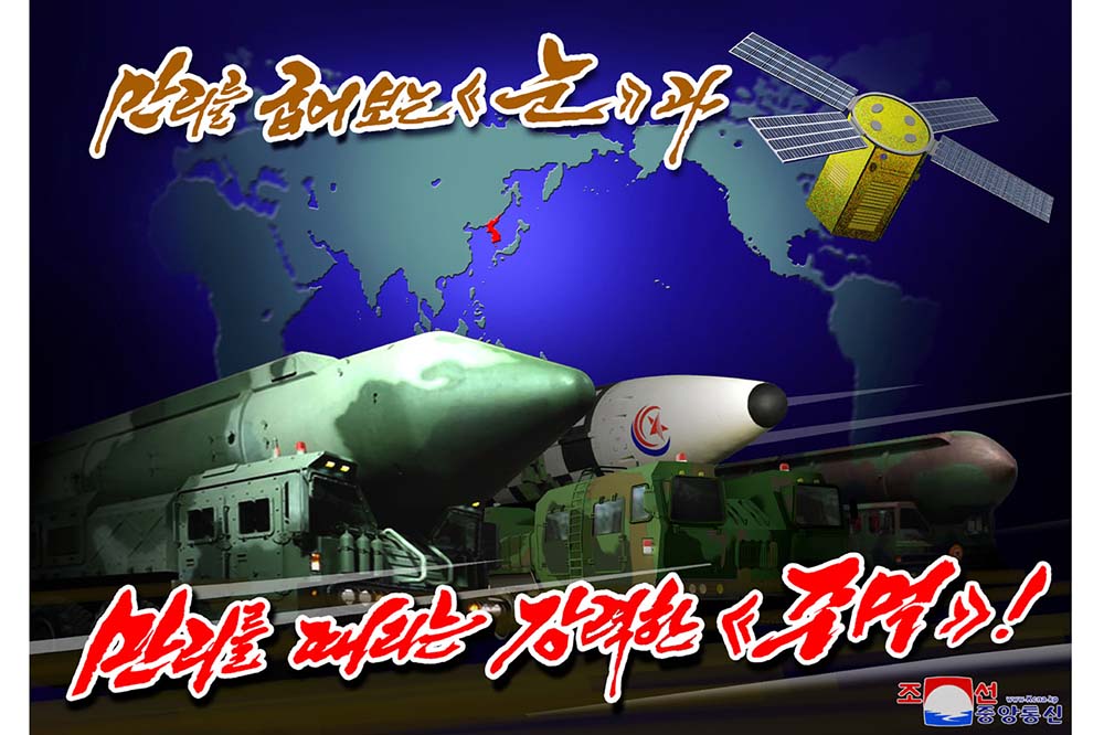 ポスターには、「共和国に到来した宇宙強国の新時代!」、「宇宙万里に轟かされたチュチェの朝鮮の国力!」、「チョンリマを駆って宇宙へ飛び上がるわれわれのマンリギョン!」、「万里を見下ろす『目』と万里を叩く強力な『券*1』!」、「偵察衛星の打ち上げ成功の快挙はわが国家の絶大な力の誇示!」、「わが国家の安全と尽きない未来のために!」があります。