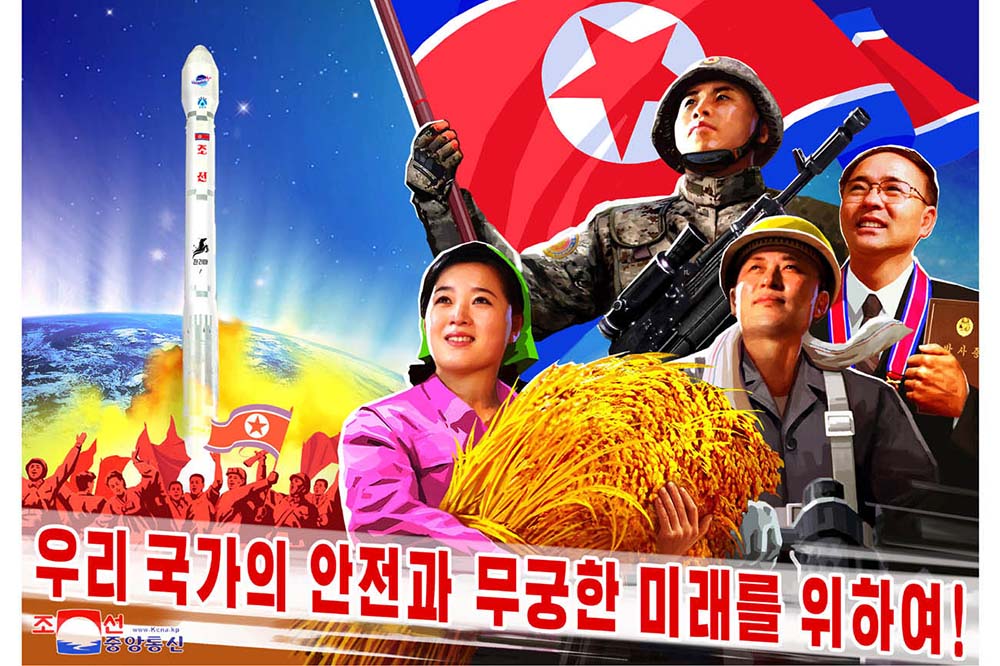 朝鮮労働党出版社と美術アトリエセンターのマンスデ創作社、中央美術創作社から偵察衛星「マンリギョン1号」の打ち上げ成功を見せるポスターが出ました。