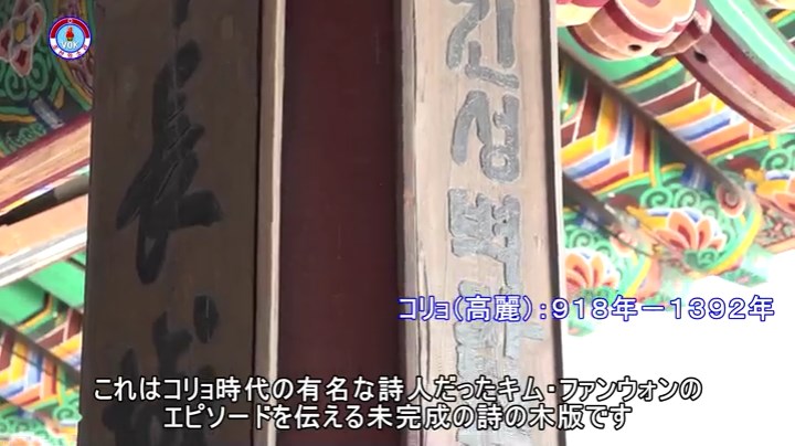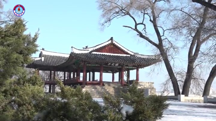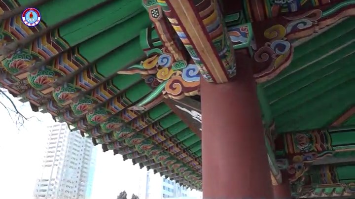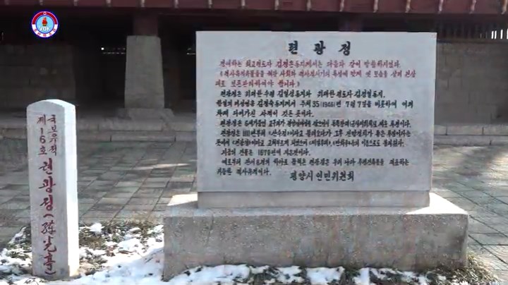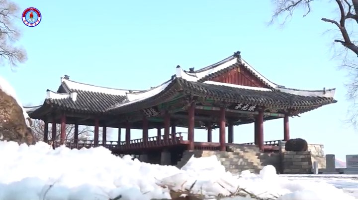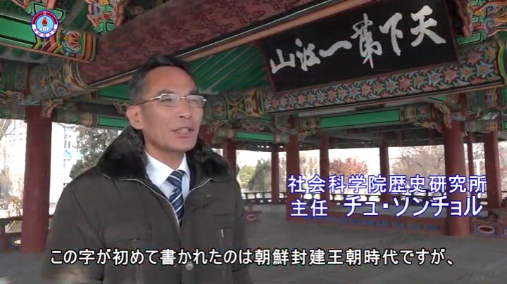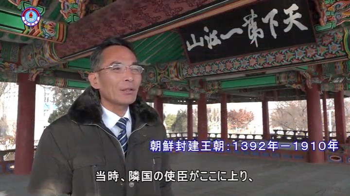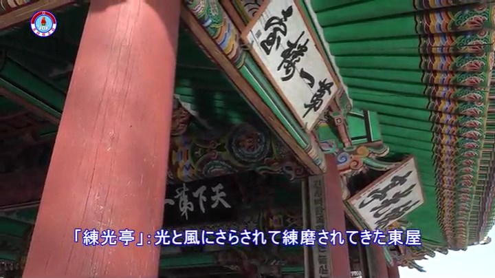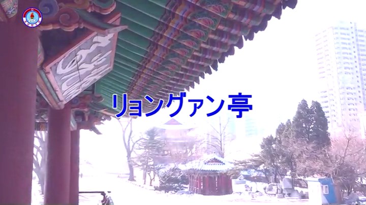 練光亭古跡リョングァン亭*1は平壌の都心を流れるテドン川*2の畔にあります。 紀元前277年から紀元668年まで存続したコグリョ、高句麗時代の6世紀中頃に建てられた東屋です。その後何度も改築され、今のは1670年に立て直された物です。 リョングァンという名は漢字で「練光」と書き「光と風に曝されて練磨されて来た東屋、見晴らしの良い東屋」という意味ですが、一頃「第一楼台」とも呼ばれました。 (字幕)「練光亭」:光と風にさらされて練磨されてきた東屋 その佇まいも独特で、2棟の楼閣がやや互い違いに建てられ、大小の2つの入母屋造りの屋根が直角で繋ぎ合っています。東屋全般がカラフルに彩られ、大梁には絹の文様が描かれています。 (字幕)「天下第一江山」 社会科学院歴史研究所主任チュ・ソンチョルさん。