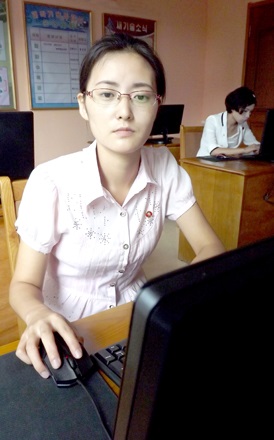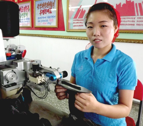 靴下の質を高めるために知恵と情熱の限りを尽くしている技術者のパク・ウンギョンさんです。ハンドクス・ピョンヤン軽工業総合大学を卒業したパク・ウンギョンさんは3年前からこの工場に勤めています。季節別のストッキングの色の多様化の研究を深めて20余りの染色の方法を完成しました。また高温高圧染色機の製作チームにも加わりました。膨大な資料の検討、機械の設計と組み立て、プログラム作成などすべきことは一つや二つではありませんでした。しかしパクさんは開発チームのメンバーと共に現場に付き切りで、高温高圧染色機の製作に成功しました。これは一つをつくっても自分の力と技術に依拠してつくるという自力自強の精神力がもたらしたものです。