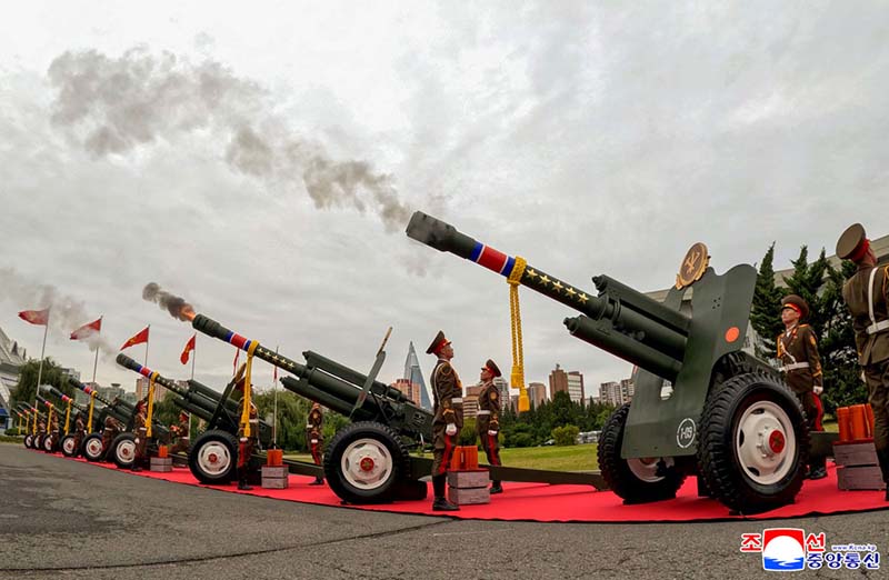 人民の自主的尊厳と真の生が保証される世界で最も偉大な社会主義わが祖国を一層しっかり守り、永遠に忠誠を尽くして従う愛国衷情が熱く満ち溢れる中、力強い総合軍楽礼式が行われた。