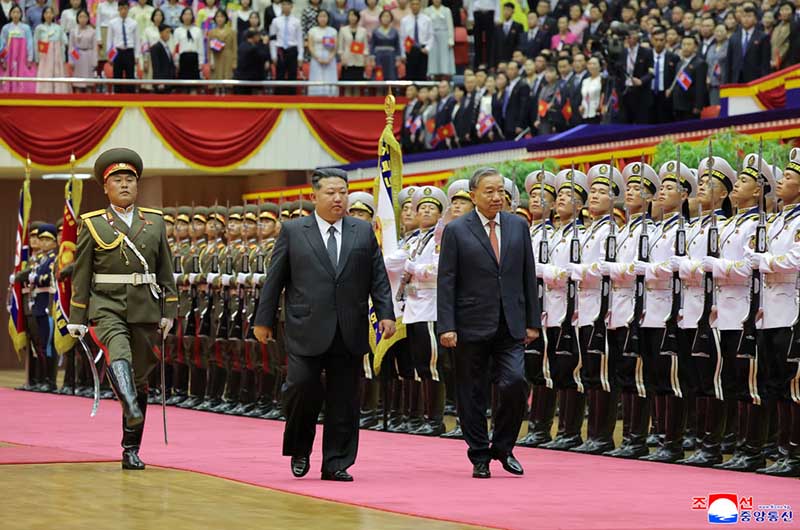 金正恩総書記の案内を受けながらトー・ラム書記長は朝鮮人民軍儀仗隊を査閲した。