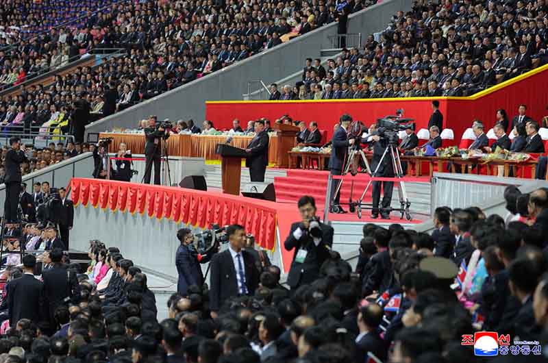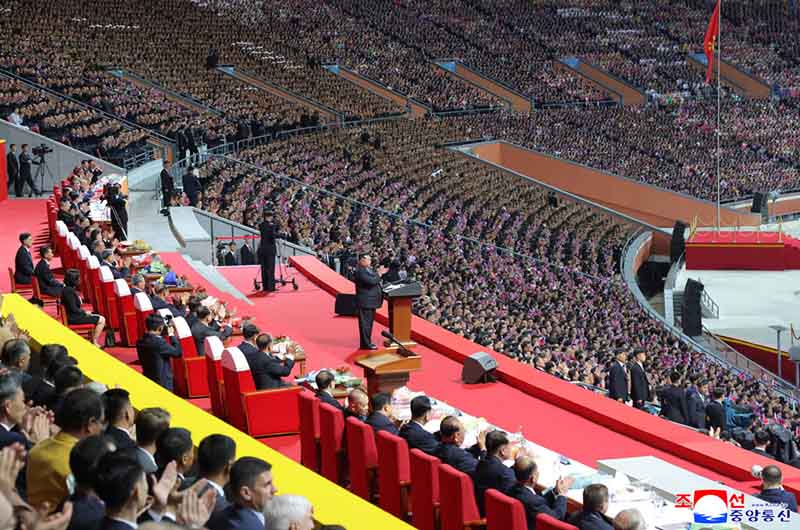 大会が行われるメーデー・スタジアムには、最も困難で試練に満ちた朝鮮革命をひとえに勝利の道へ導き、わが国家の不滅の尊威と名誉、英雄主義を歴史の巨峰に押し上げた朝鮮労働党の栄えある80星霜にささげる人民の限りない祝福の心が熱く満ち溢れていた。