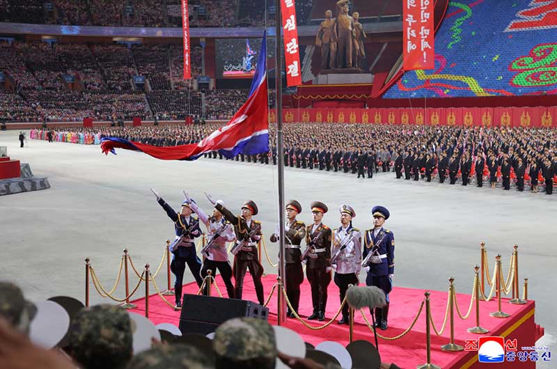 朝鮮民主主義人民共和国の国旗と朝鮮労働党旗を掲揚する儀式が行われた。