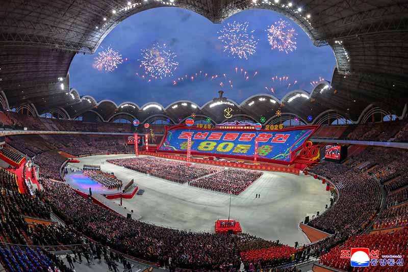 聖なる党創立の理念と精神で勝利と栄光の80星霜を歴史に輝かせてきた導き手である朝鮮労働党を仰いで人民が歌う称賛の歌が祖国の山河に限りなく響き渡る中、10月9日夕、メーデー・スタジアムでは朝鮮労働党創立80周年慶祝大マスゲーム・芸術公演「朝鮮労働党万歳」が盛大に行われた。