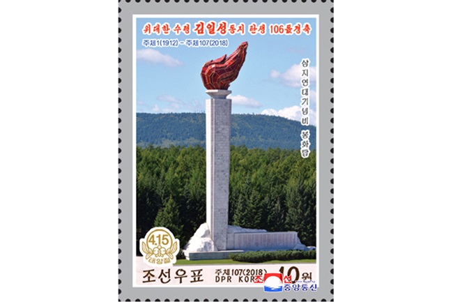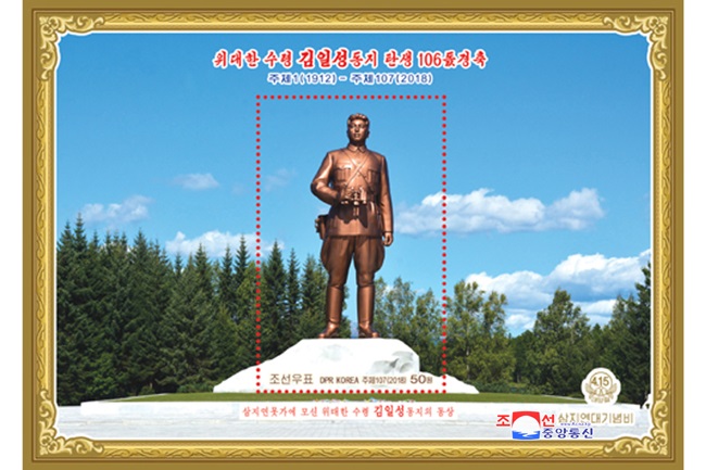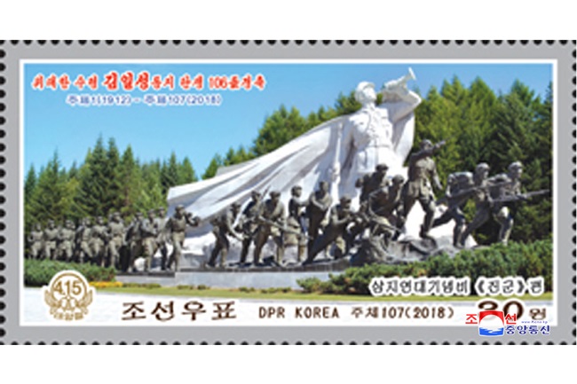 小型シート1種と個別切手2種で、切手の上には「偉大な金日成主席の生誕106周年記念 チュチェ1年(1912)~チュチェ107年(2018)」と書かれています。小型シートの中心には三池淵の湖畔にある金日成主席の銅像がデザインされています。「三池淵大記念碑の烽火の塔」と「祖国への進軍路に発つ抗日遊撃隊員」を表すサブテーマの彫刻群像がデザインされた切手もあります。