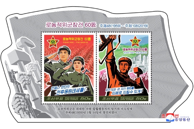 ブロックシートの上には「労農赤衛軍の創建60周年」、「チュチェ48(1959)-チュチェ108(2019)」という字が、下には「労農赤衛軍は偉大な金日成主席の発案と指導の下、チュチェ48(1959)年4月14日に創建された」という字が書かれています。