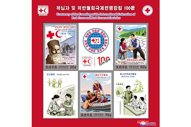 ブロックシート1種で、上に「国際赤十字・赤新月社連盟設立100周年」と言う字が書かれ、朝鮮民主主義人民共和国赤十字会のマークと国際赤十字・赤新月社連盟のマークがデザインされています。