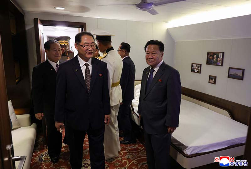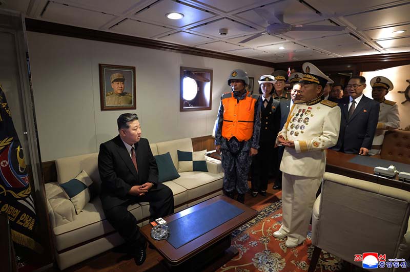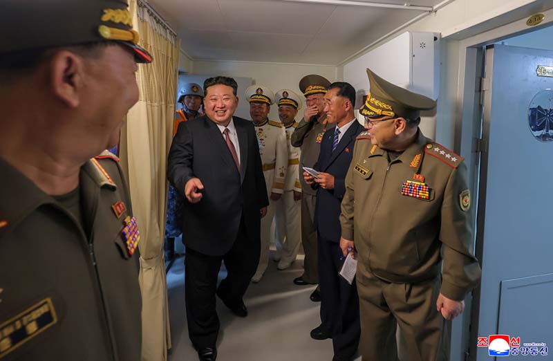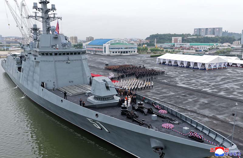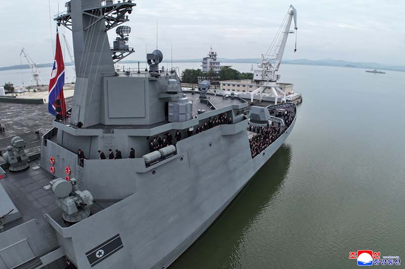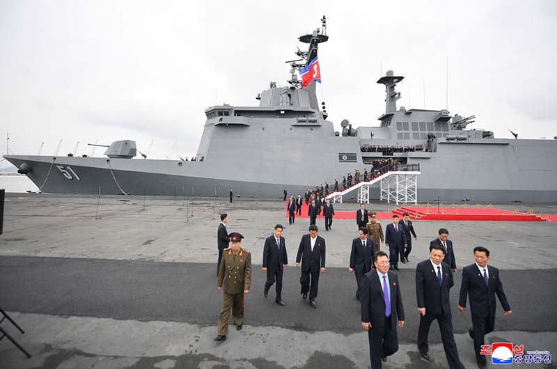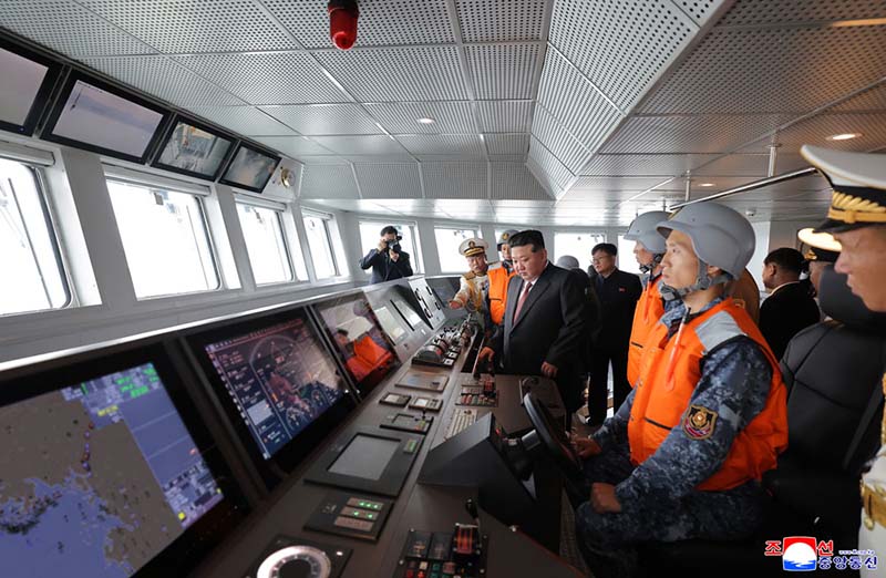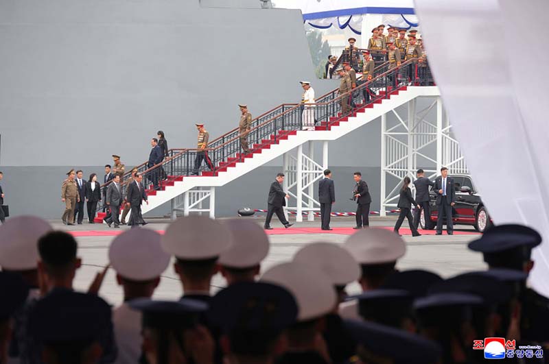 敬愛する金正恩総書記が武力装備展示会「国防発展・敬愛する金正恩総書記が武力装備展示会「国防発展・2025」の2日目の参観日程に従って開幕式参加者と共に駆逐艦「チェ・ヒョン」号を見て回る