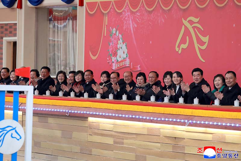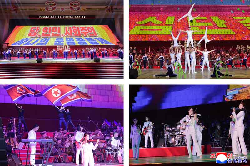 朝鮮労働党総書記で朝鮮民主主義人民共和国国務委員長である敬愛する金正恩同志が、リ・ソルチュ女史と愛するお嬢様と共に観覧席に姿を現すと、栄光の瞬間を待ち焦がれた参加者の感激が嵐のような「万歳!」の歓呼の声となって激しく噴出した。