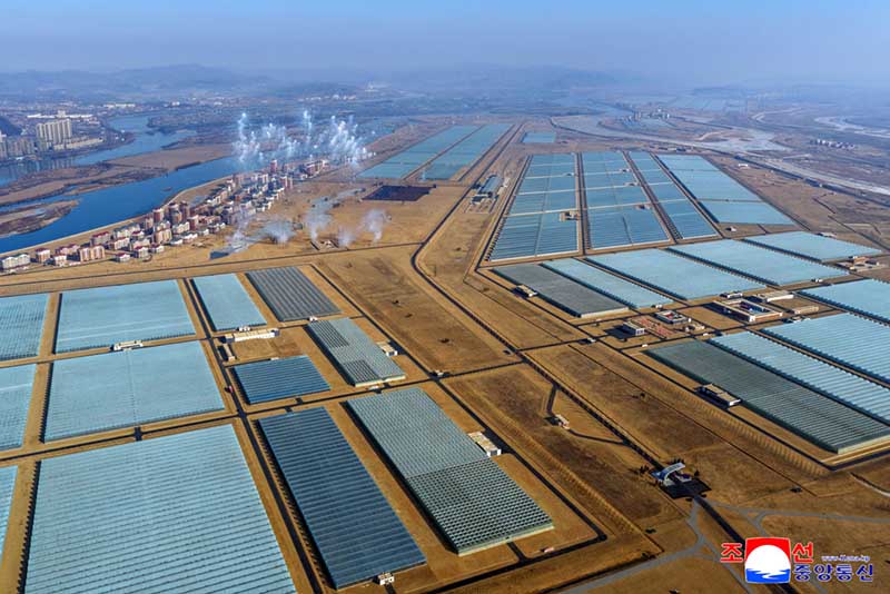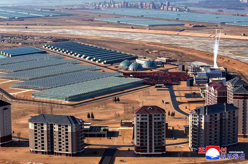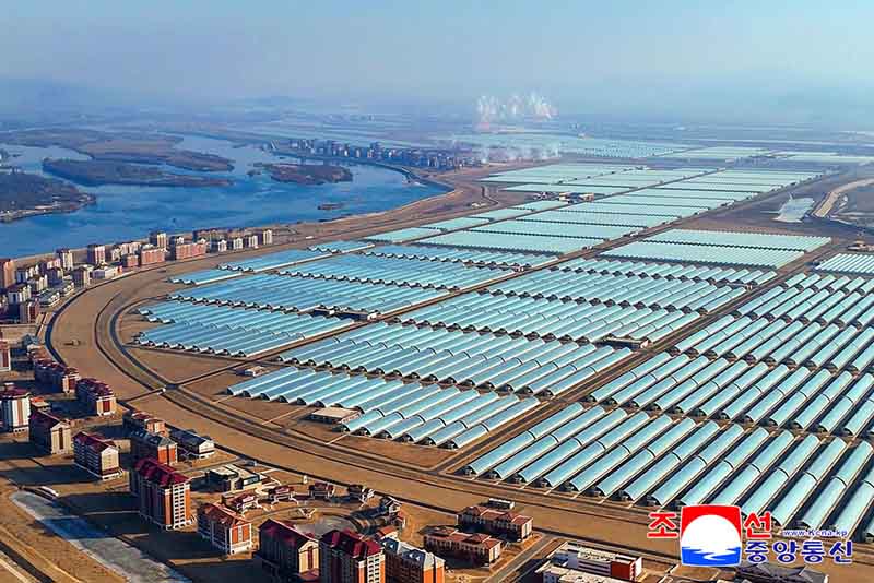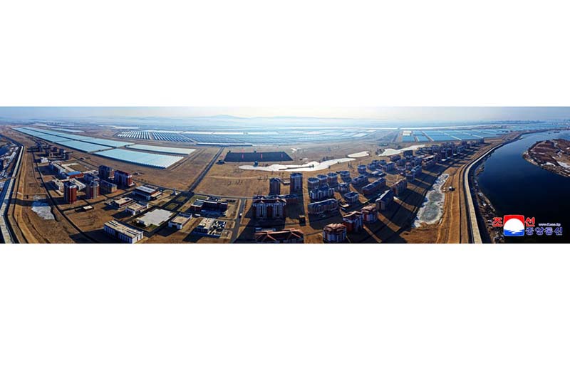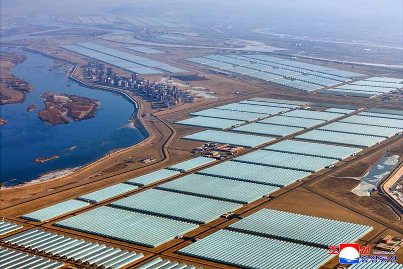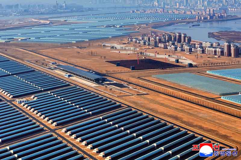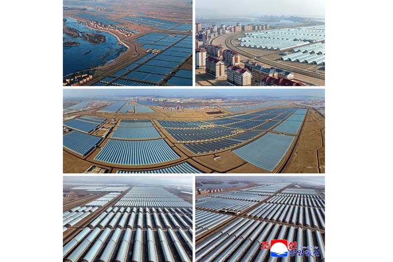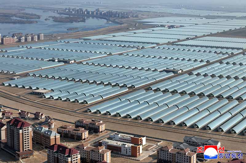 一千数百棟のさまざまな類型の近代的な温室と野菜科学研究中心、文化住宅、多様な文化生活拠点とユニークな緑の景観が美しく調和したシンイジュ温室総合農場は、金正恩時代の偉大な変革史を証明するもう一つの誇るべき記念碑的建造物であり、われわれの青年建設者が朝鮮労働党第9回大会にささげる誇らしい忠誠の贈り物である。