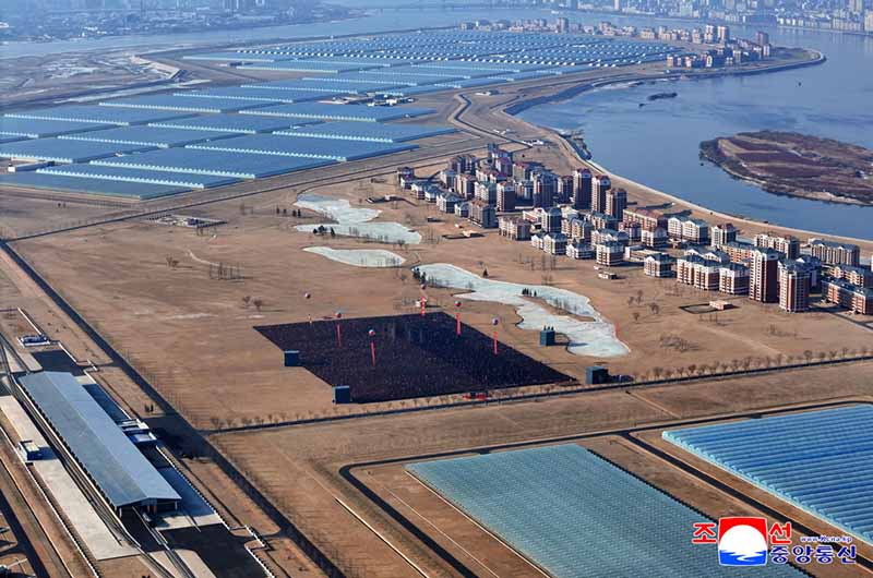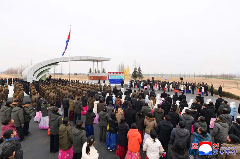 金正恩総書記は、党の雄大な地方発展構想と決心を絶対の真理として受け止め、燃えるような愛国の熱情と勤労の闘いによってこの島地区を新時代の理想的な農場都市に立派に変貌させたわが軍の将兵と青年建設者に温かい激励のあいさつを送った。