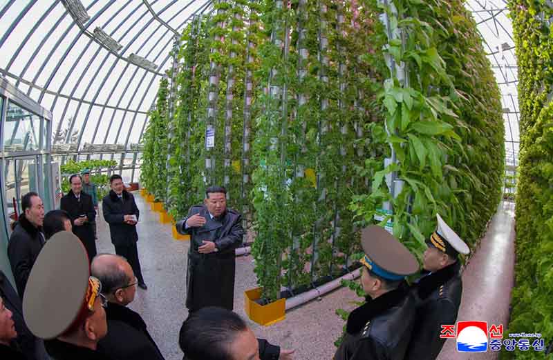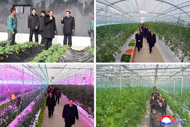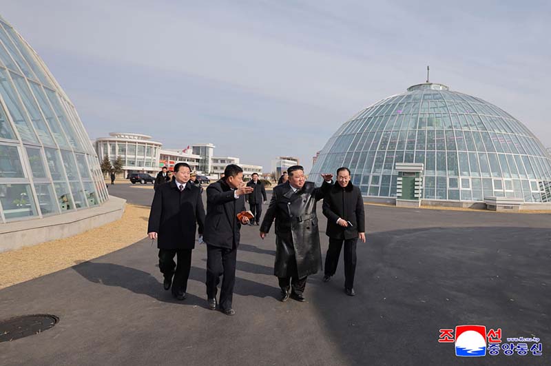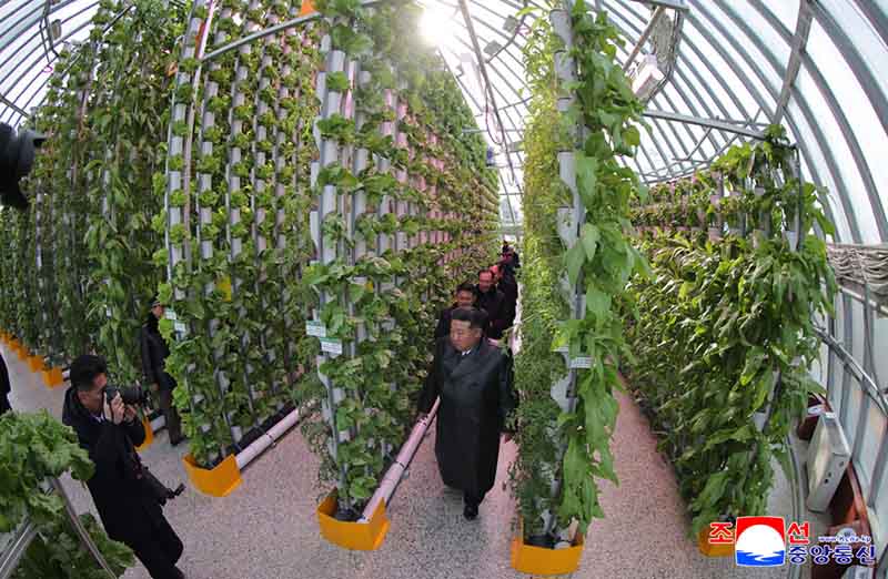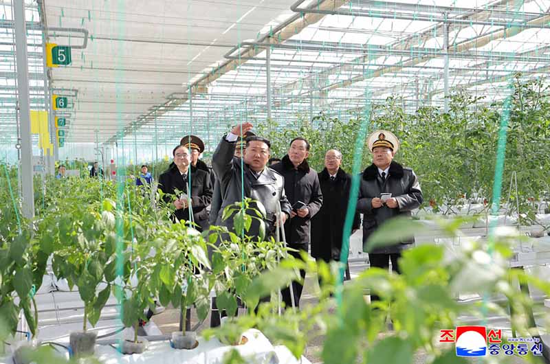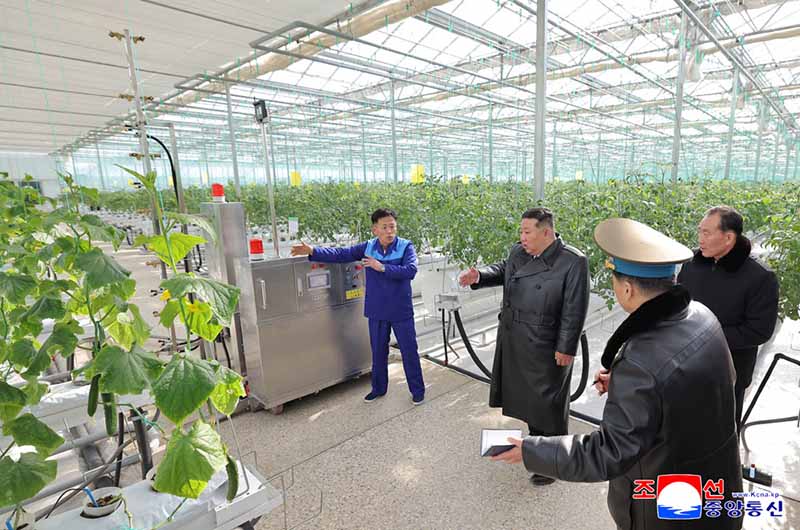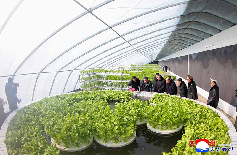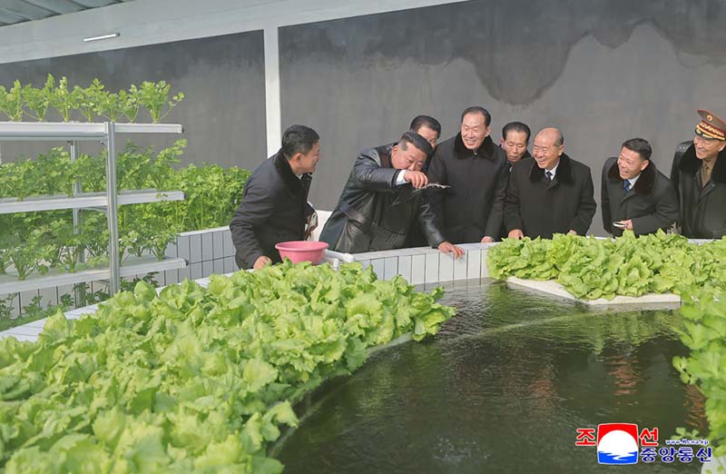 金正恩総書記は、養魚と野菜の栽培を兼ねたソーラー温室をはじめ複数の類型の温室を見て回った。