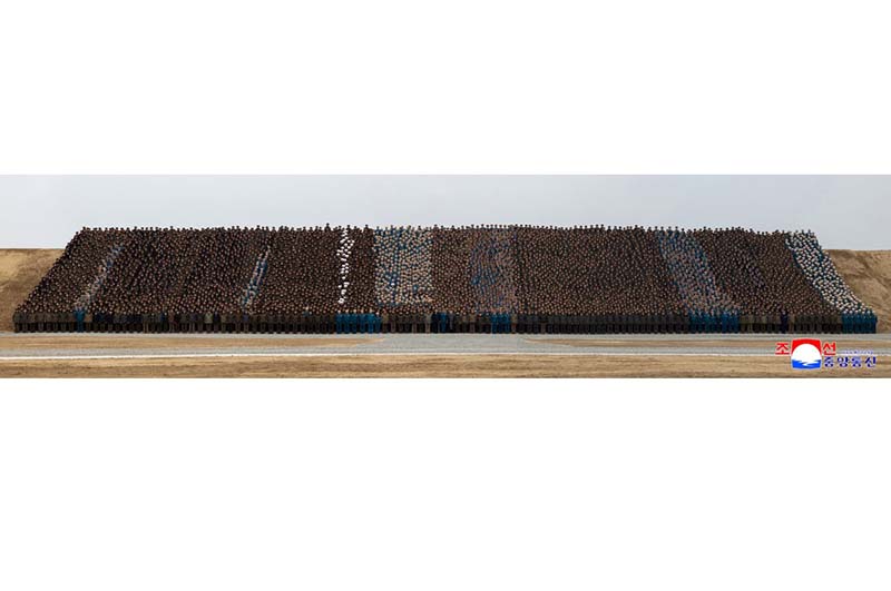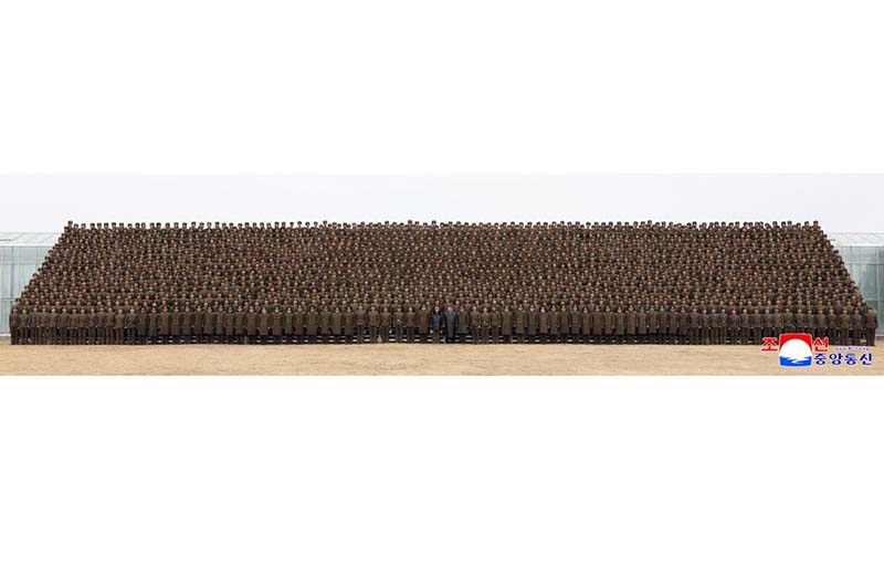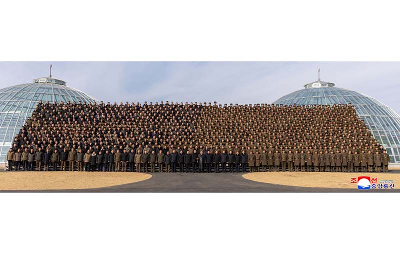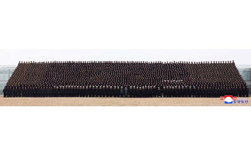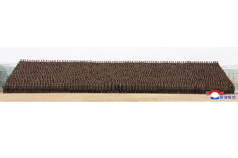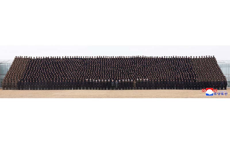金正恩総書記は同日、シンイジュ温室総合農場の建設に参加した軍人建設者、青年前衛と愛の記念写真を撮った。