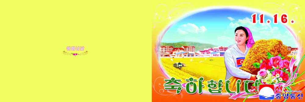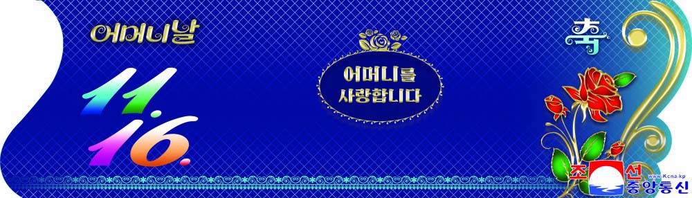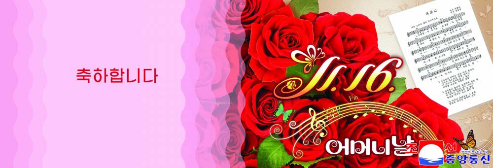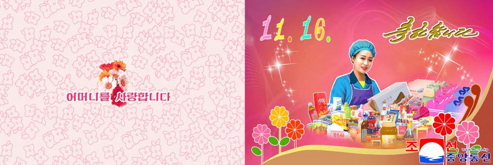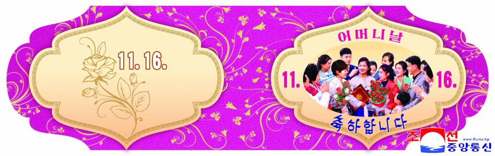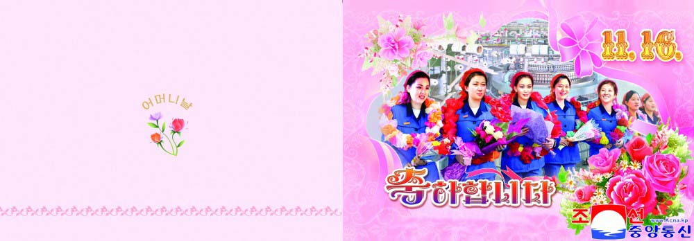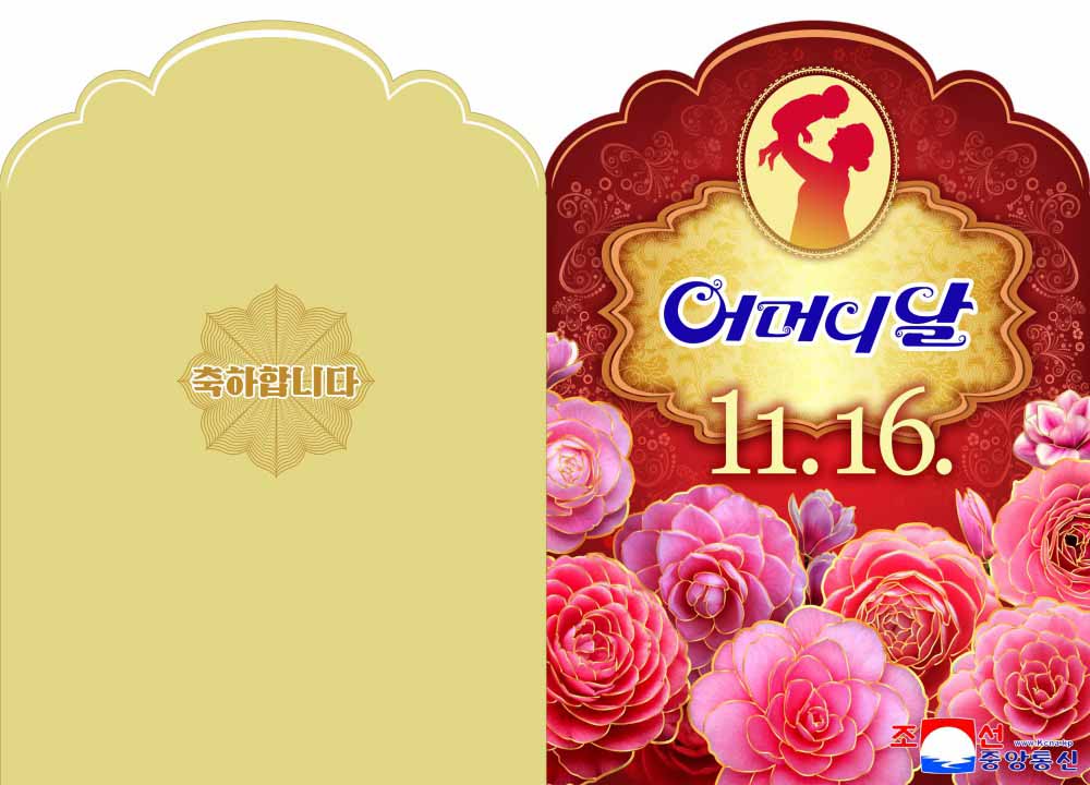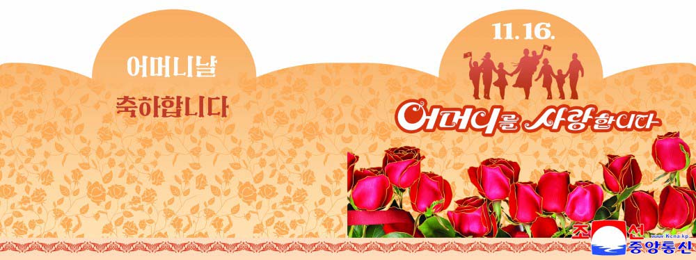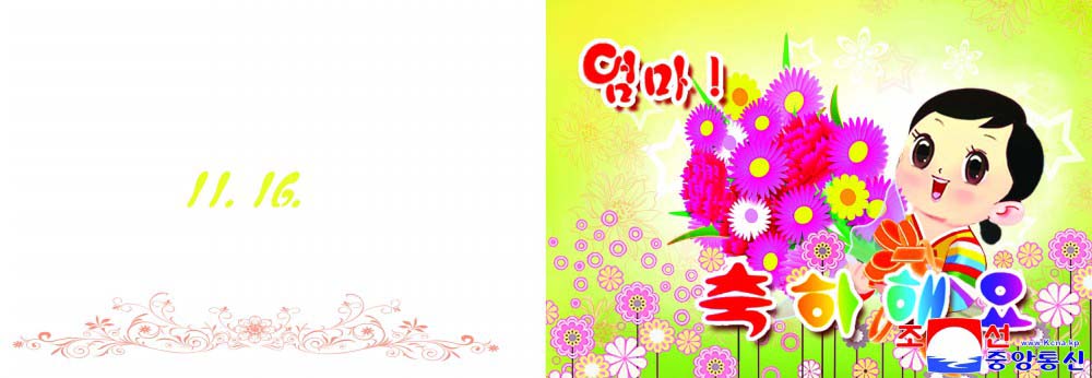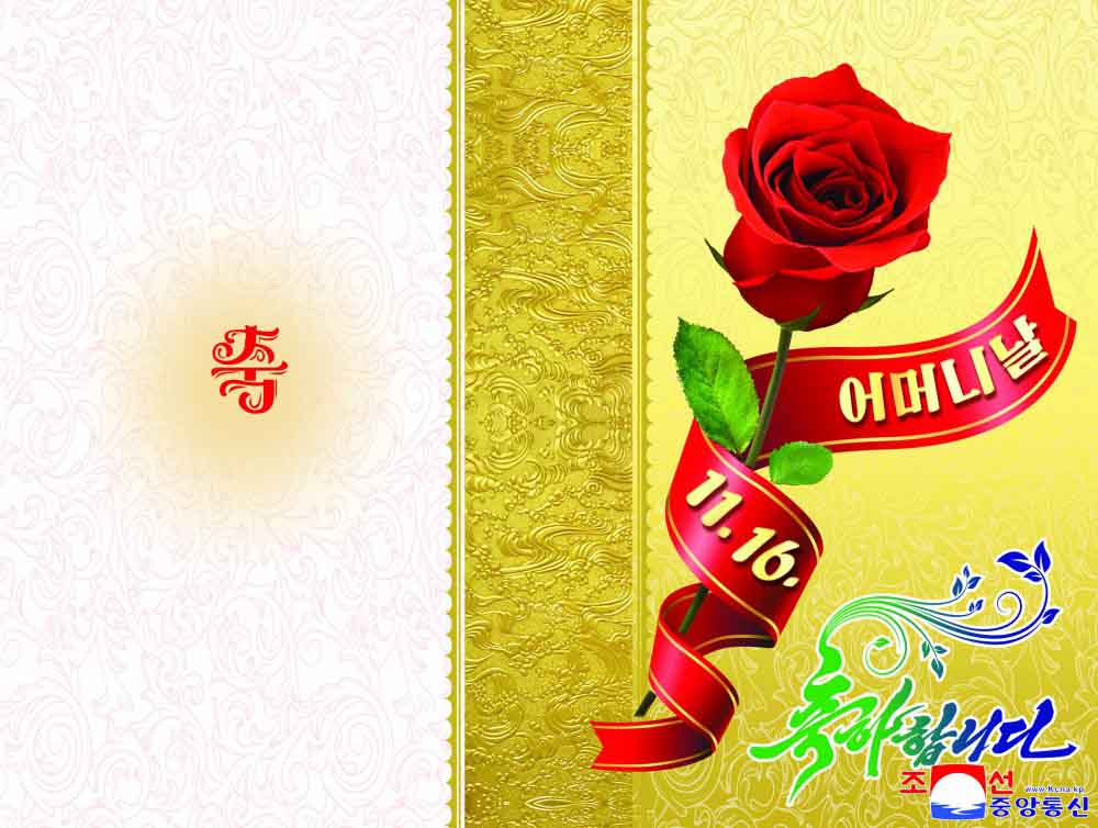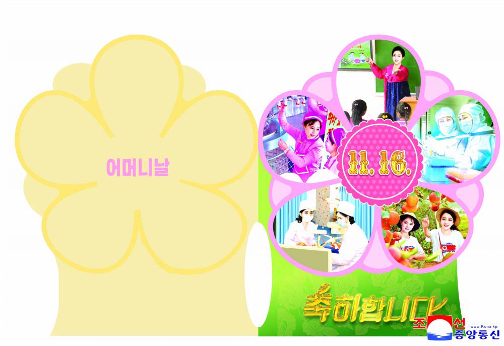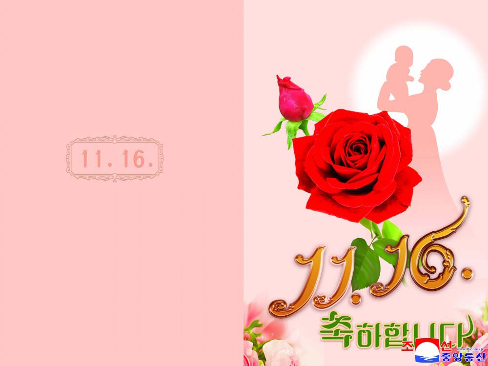 「11月16日、おめでとう、母の日」 「母の日をお祝いします」などの字が多様な書体で書かれた祝賀状には、熱い母性愛と尽きない献身で家庭と社会に対して担った本分を全うし、社会主義の大家庭の花園を美しく育む母親たちへの尊敬と愛情が込められています。