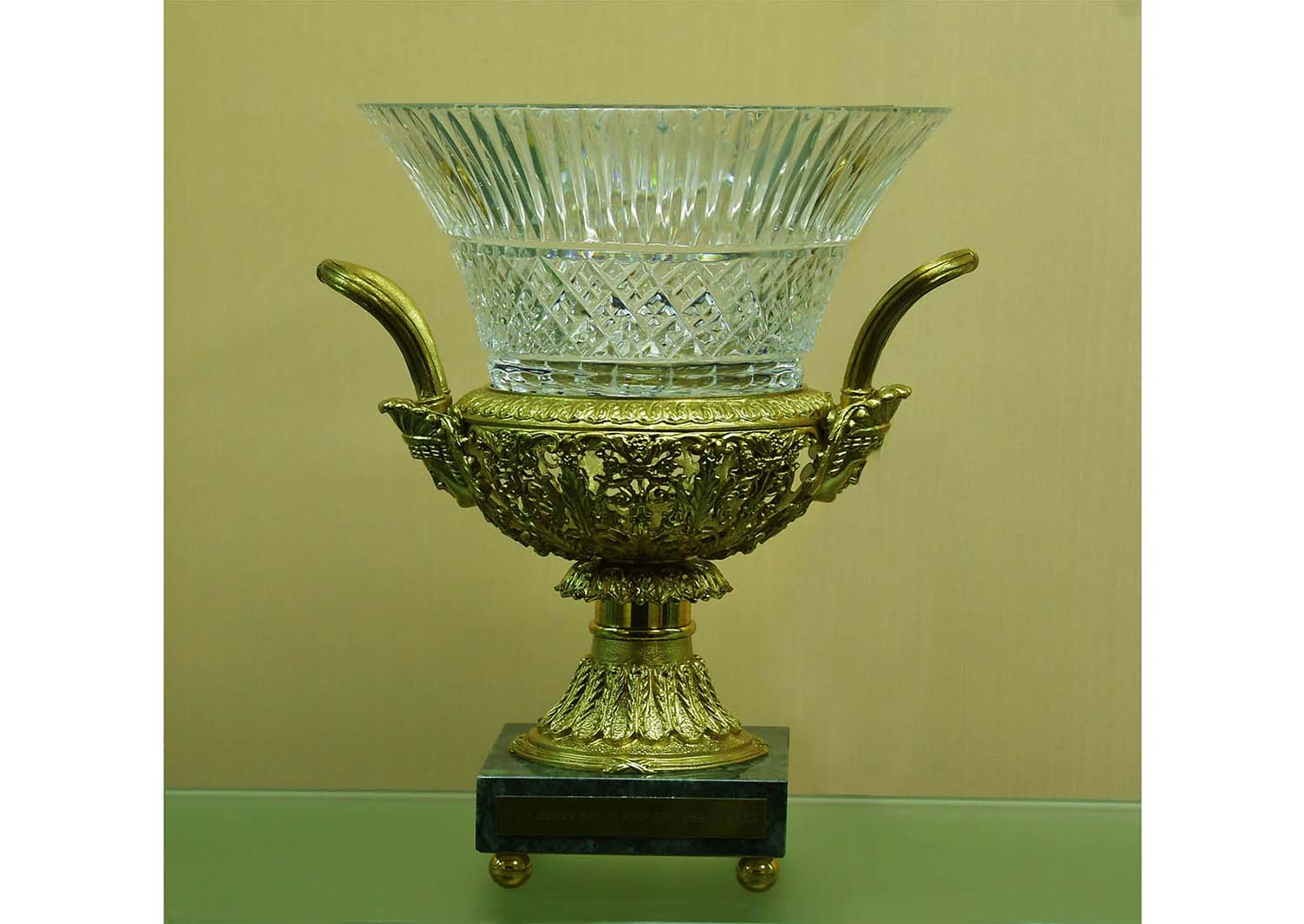 水晶の器を支える枠と台石も美しい工芸品です。金属の枠には、美人と花模様が透かし彫りの技法で表されています。台石は、ロシアで幸運と富、友好を象徴する石となっている孔雀石からなっています。