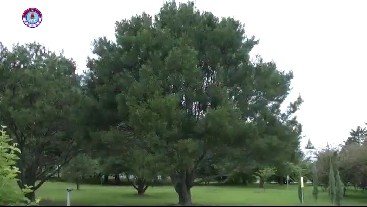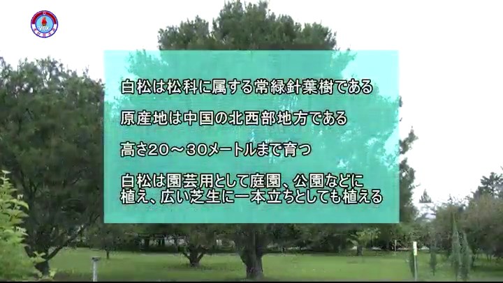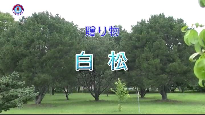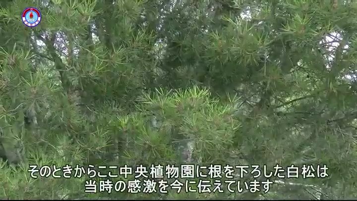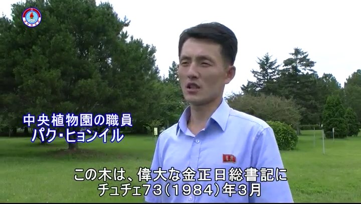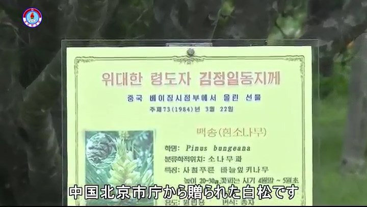 「この木は、偉大な金正日総書記にチュチェ73(1984)年3月、中国北京市庁*1から贈られた白松です。北京市庁が総書記にこの白松を贈ったのには訳があります。チュチェ72(1983)年6月、訪中の途にいた金正日総書記は、北京市の都心にある景山公園を訪れました。総書記は公演を見て、皮がすべすべして白みが多い白松を指してとても良い木だと言いました。その後、市庁は景山公園のその木を大事な物としてきちんと管理しました。北京市庁は、郊外の育苗場で一番立派な白松の苗を選び、特別育てて、そのうちの5本を総書記に贈りました。そのときからここ中央植物園に根を下ろした白松は当時の感激を今に伝えています」