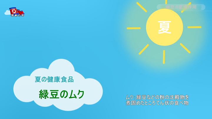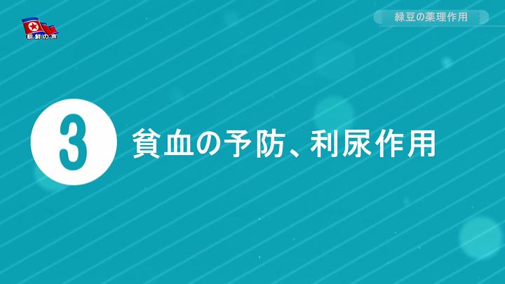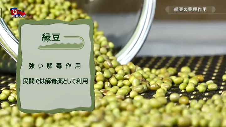 緑豆の薬理作用*1呉英淑(オ・ヨンスク):緑豆は栄養成分が豊かで薬用成分も含む穀物なので、薬種として広く使われています。 1. 緑豆の解毒作用緑豆は解毒作用が強く、昔から民間では解毒薬として広く使われました。 緑豆にあるビタミンB群・ブドウ糖・コリン・燐脂質のような成分は、薬物中毒・アルコール中毒・食中毒等の中毒を解除する作用をします。 水煮緑豆を入れて沸かした後、蜂蜜を混ぜれば解毒作用がもっと強くなるといいます。 2. 緑豆の解熱作用緑豆は解熱作用と夏ばてを防ぐ作用をするので、夏の健康に良い食品です。 食欲が無く体のだるい夏に、涼しくて気力をそそる緑豆のムク*2を食べるのが良いでしょう。 3. 貧血の予防、利尿作用緑豆は貧血の予防・治療にも効果がありますが、それは緑豆に鉄・コバルト・亜鉛・銅等の成分があるからです。 その他にも緑豆は利尿剤の効果があり体の抵抗力を高め、むくみを治す作用もします。 (レクリエーション、視聴者と共に―あなたの健康のために) 2025.10.14の記事