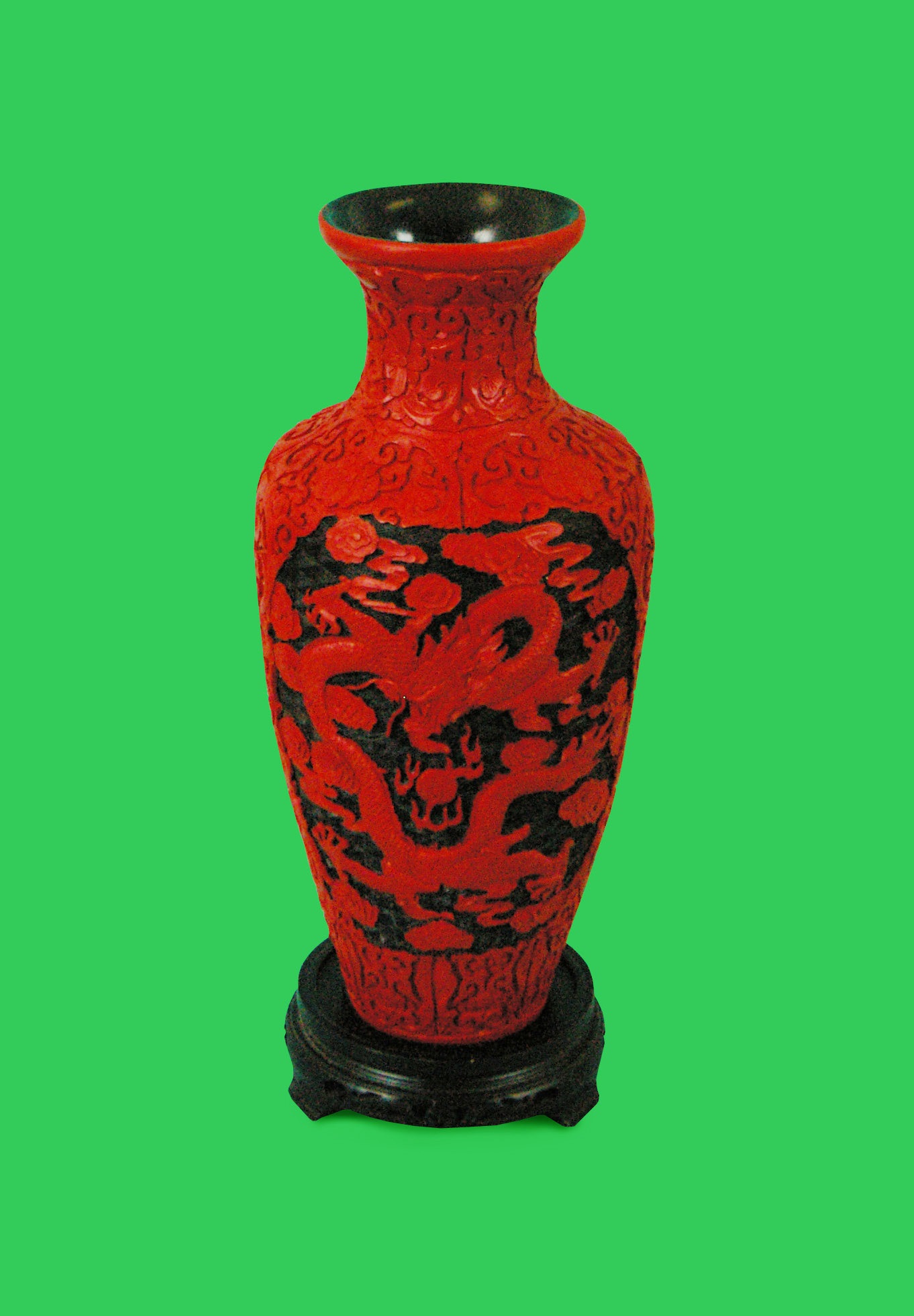 花瓶には、竜が赤い色で浮き彫りにデザインされています。中国では昔から竜が王の品格を象徴したといいます。花瓶の高さは39センチメートルです。