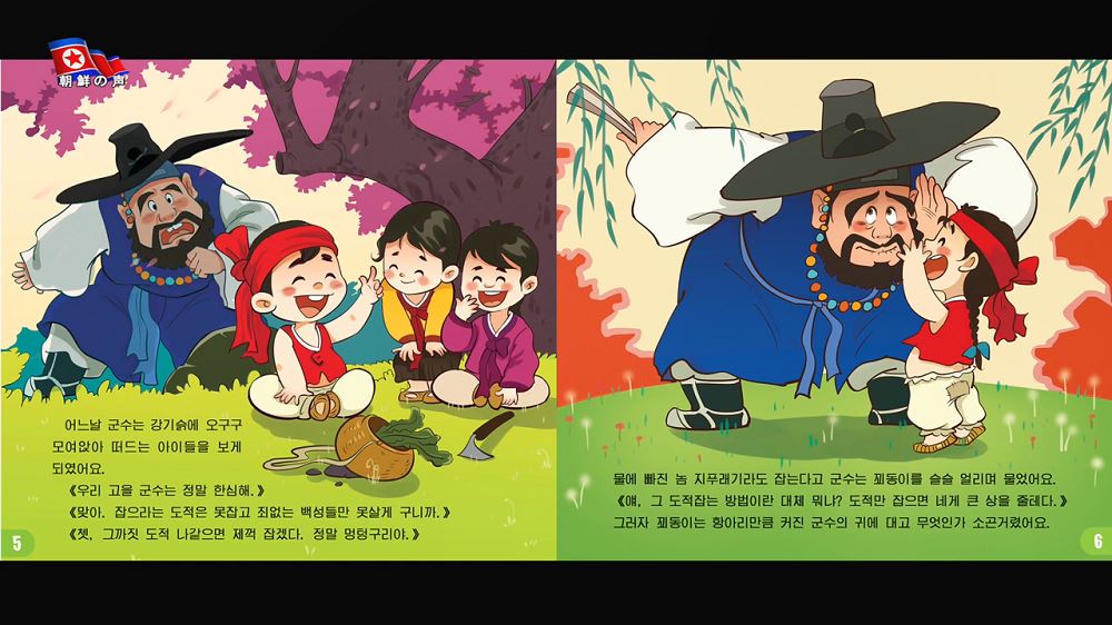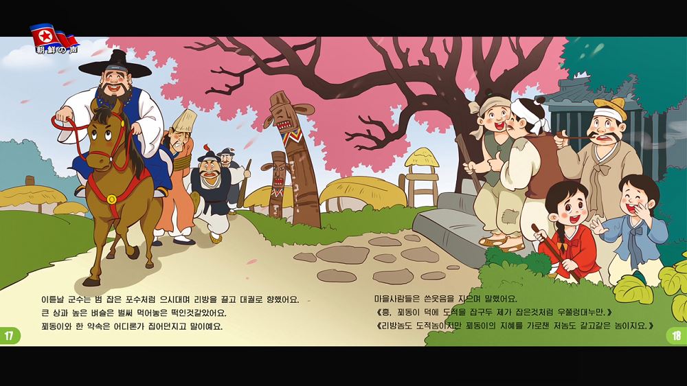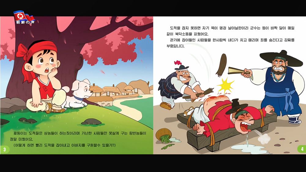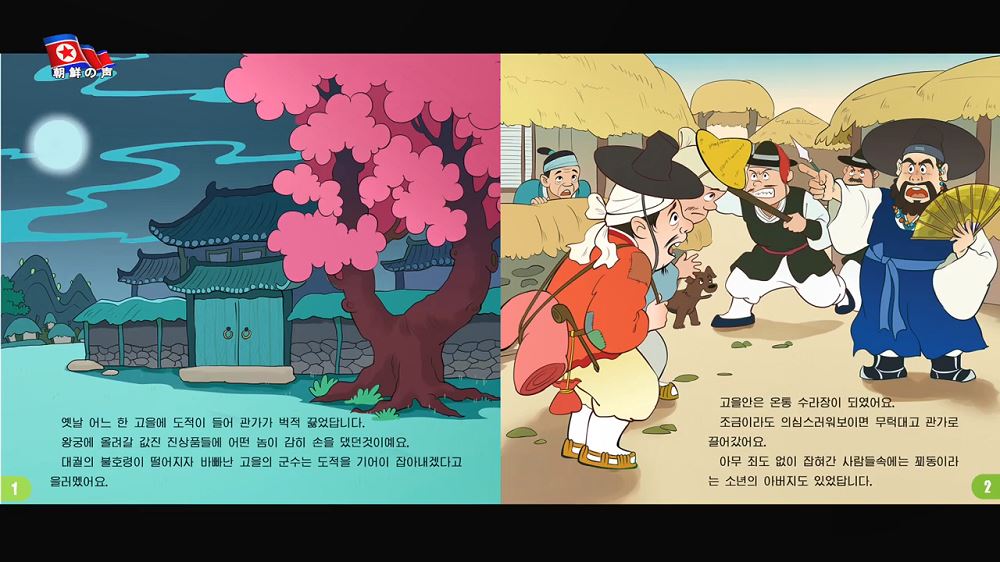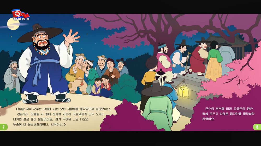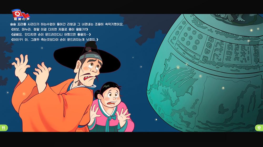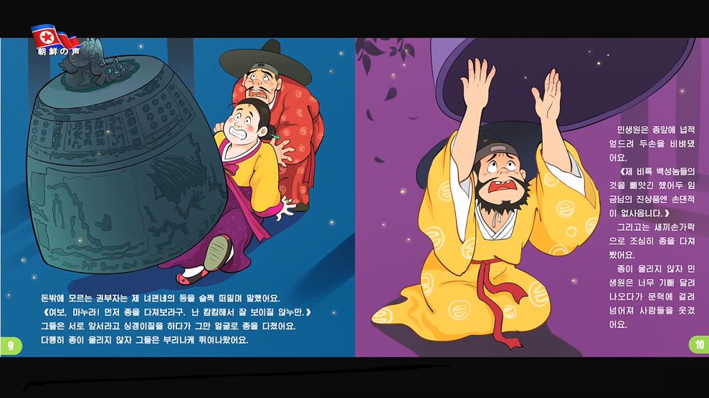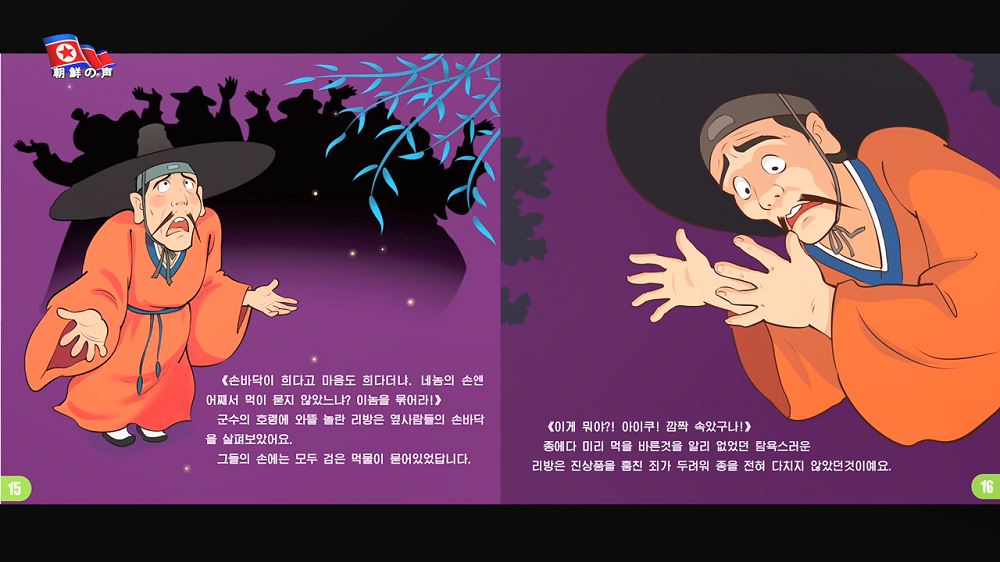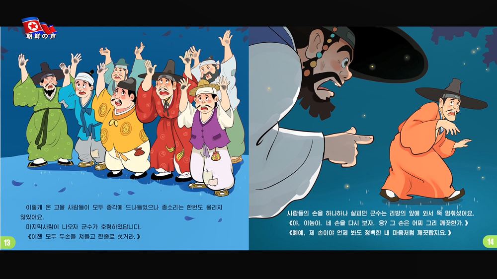 名作童話の絵本「鳴らなかった鐘」昔、ある村で窃盗事件が起きたので、官庁は大騒ぎでした。 王宮に奉納する高価な貢物が盗まれたのです。 王宮から雷が落ちると慌てふためいた村の首長は必ず泥棒を捕まえて見せるとたんかを切りました。 村中は文字通りの修羅場と化しました。 いささかでも疑わしいと思われる人は頭ごなしに官庁に連れて行かれました。 逮捕された無辜の人たちの中には、クェドンという少年の父親もいました。 クェドンは物を盗むのは貧しい人たちに限るとして、生活が苦しい人たちを苛めるリャンバンの輩が憎たらしくてたまりませんでした。 (どうすれば早く泥棒を捕まえてお父さんを救い出せるだろうか) 泥棒が捕まらないと俺の首が危ない、村の首長は焦り立って、毎日のように村中を騒がせました。 官庁に投獄された人たちを一人ずつ呼び出しては蹴ったり、殴ったり、白状しないでいると濡れ衣を着せたりする有様です。 ある日、村の首長は川岸に集まってがやがや言っている子供たちをみました。 「うちの村の首長って駄目な人ね」 溺れる者藁をも掴む思いで、村の首長はクェドンを宥めながら聞きました。 「おい、その泥棒を捕まえる方法とは一体何だい? 泥棒さえ捕まえればお前に褒美をやるから」 するとクェドンは好奇心に駆られた主張の耳元に何か囁きました。 あくる日の夕刻、村の首長は村人全員を鐘楼の前に呼び出しました。 「みんな聞くんだ、今夜、あの鐘に不思議な気運が宿ったのだ、だからもし泥棒が触れば鐘は自然と鳴るんだ、罪を恐れて触らなければ、両手が腐ってしまう、さあ、始めろ」 首長の命令に従って、村中のリャンバン、百姓みなが順番に鐘楼の中に入ったり、出たりしました。 金のことしか頭にない長者のクォン氏は妻の背中をそっと押しながら言いました。 「お前、先に触って見ないか*1、俺は暗くてよく見えないからな」 長者の夫婦は互いに後ずさりして、言い争いましたが、そのはずみに顔が鐘にぶつかりました。 幸い、鐘は黙り込んだままです。 くわばら、くわばらと長者の夫婦は飛び出しました。 リャンバンのミン氏は鐘の前にひれ伏して、両手をこすり合わせました。 「俺は百姓からは物を取り上げましたが、王様への貢物には指一本触ったことありません」 言い終えてから小指でそっと鐘に触って見ました*2。 鐘が鳴らなかったので、ミン氏は嬉しさの余り、小走りして出てくるはずみに敷居に足を取られて倒れてしまいました。 どーっと爆笑が起こりました。 ぬらりくらりと逃げ道を捜していた官庁の役員*3とその妻はやむ無く、鐘楼に入り、ひそひそと話し合いました。 「お前、どうだい、これに触れば本当に鐘が鳴るのかね」 こうして、村人全員が一人残らず鐘楼に出入りしましたが、鐘はずっと沈黙を守っているだけです。 最後の人が鐘楼から出ると首長は命令しました。 「今度はみな両手を揚げて一列に並ぶんだぞ」 一人一人の手を詳しく見ていた首長は官庁の役員の前で歩みを止めました。 「こいつめ、お前の手をもう一度見せてくれ、なぜお前の手はこんなにきれいなのか」 「掌が清いからと言って心も清いとは限らん、お前の手に墨がついていない理由を聞いているのだぞ、こいつを縛り付けろ!」 主張の言葉にびっくりした官庁の役員は傍の人たちの掌をかわるがわる見ました。 みな手に真っ黒い墨をつけていました。 「これは一体どういうことだ、しまった!騙されたんだ!」 鐘に予め墨を塗っておいたのを知る由もなかった貪欲なその役員は貢物を盗んだ罪が暴かれるのを恐れて鐘に一切触らなかったのです。 あくる日、主張は鬼の首を取ったように有頂天になってその役員を王宮に押送しました。 褒美と高い官職はもう網の鳥のようなものです。 クェドンとの約束は反故にし、それでも平気な顔です。 村人たちは苦笑いしながら言いました。 「ふん、クェドンのお陰で泥棒を捕まえたくせに、自分の手柄のように自慢しているね」 (コンテンツ―本) 2025.09.29の記事