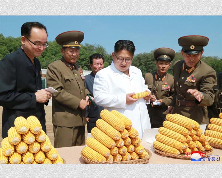 金正恩委員長は農場でトウモロコシと陸稲の新種を育種したと言う話を聞いて、喜び勇んで出かけてきた、とし、取り入れたばかりの収量の多い品種の農作物を見ました。腕ほどもあるトウモロコシの実と充実した稲穂は見る程素晴らしいものでした。金正恩委員長は、見事なものだ、すこぶる満足だ、と言って、トウモロコシの新種について詳しく把握しました。そしてトウモロコシの新種を「ピョンオク9」と命名しました。
