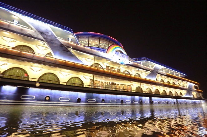 ピョンヤンの風光に恵まれたテドン川には来客の絶えない船が浮かんでいます。総合サービス船「ムジゲ」号*1です。ムジゲとは朝鮮語で虹を意味します。この「ムジゲ」号は敬愛する最高指導者金正恩委員長の深い関心の中、生まれた船です。