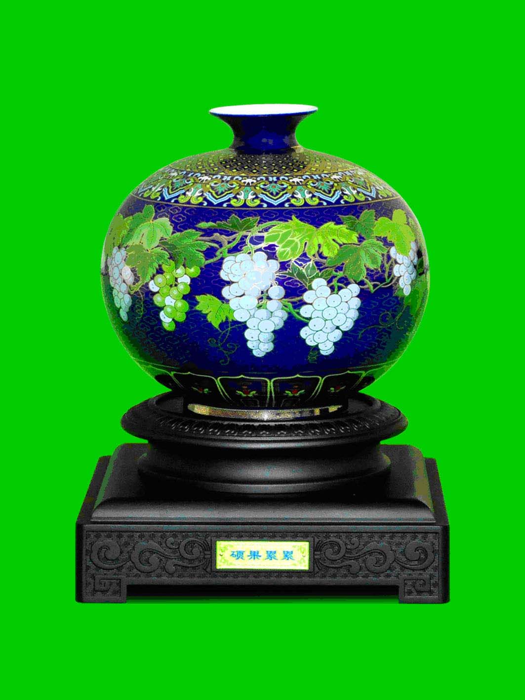 花瓶は景泰藍の技法で作ったものだと言います。北京の景泰藍の焼き物の製作技術は中国の国家無形文化遺産に登録されています。福建省福州の漆工芸品や江西省景徳鎮の焼き物と共に一定量の金属を配合して作った北京の景泰藍の焼き物も中国で歴代の王や貴族だけが使ったものでした。藍色の下地の花瓶の前面にはたわわに実った葡萄の房と生い茂るつる、葉が描かれ、台には「碩果累累」という文字が中国語で書かれています。