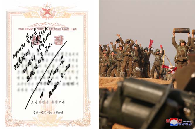 金正恩委員長は、大差をつけて優勝したある砲兵大隊を高く評価して、腕利きの砲射撃だ、狙撃兵器で目標板の点数を取るようだと言いました。そして、大隊に授ける名砲手の賞状にお祝いの直筆を残しました。