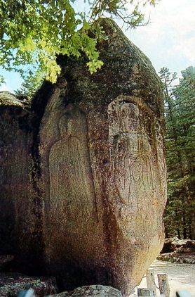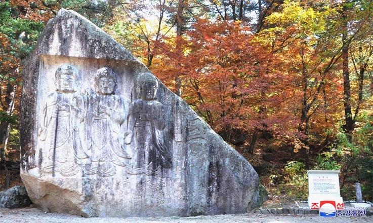 クムガン山*1のサンブルアム*2は3つの仏像が刻まれたトライアングルの形の花崗岩です。岩の高さは8メートル、長さは9メートルで、正面と側面、そして後面にも仏像が刻まれています。
