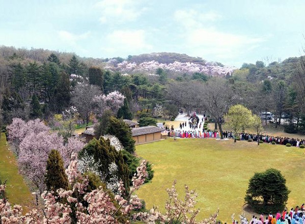 4月15日の主席の生誕日を迎えて、春のマンギョンデは祝日ムード一色です。大勢の人々が引っ切りなしに主席の生家を訪れます。