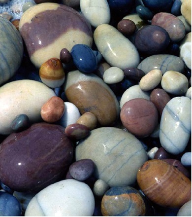 大きさは海に向かうにつれ段々小さくなり、陸地と海の境目のところでは普通の海辺の石ころや粒の大きい砂ほどのものになっています。