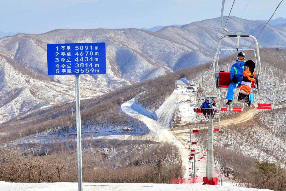 共和国の有名なマシク峰スキー場*1がオープンしたのは、チュチェ102(2013)年12月31日です。標高1360メートルのテファ峰の頂点を起点に、10の滑降コースがあります。