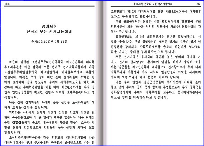 チュチェ87(1998)年、最高人民会議第10期代議員選挙が行われる前にあったことです。選挙に先立って、偉大な金正日総書記は公開書簡を送りました。金正日総書記は公開書簡で、共和国の政権は偉大な金日成主席の導きの下に人民自らが建てた真の人民の政権であり、社会主義偉業の強い武器である、全ての有権者は共和国の公民としての高い栄誉と誇りを持って選挙にこぞって参加すべきだ、と明言しました。