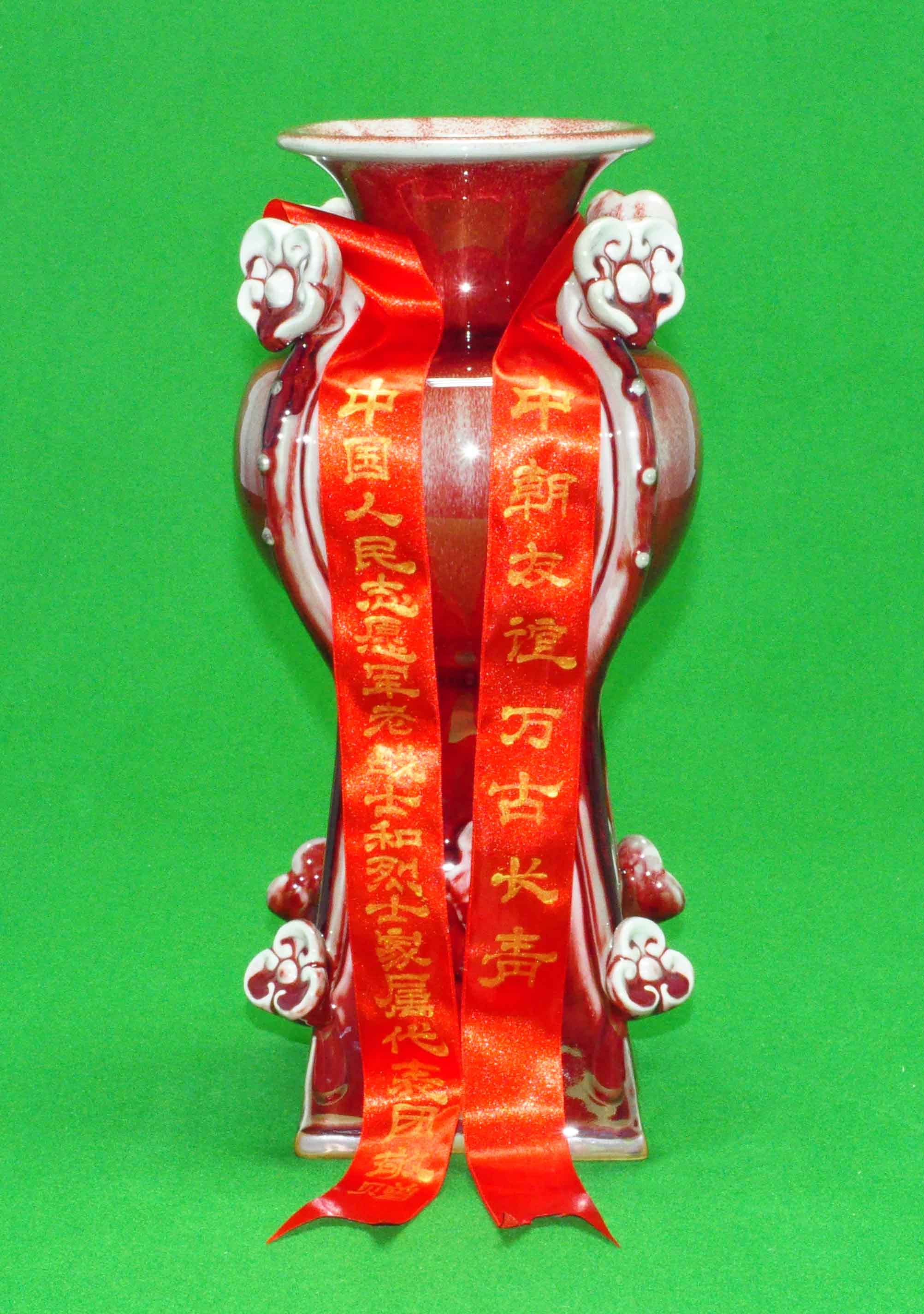 敬愛する金正恩総書記にチュチェ102(2013)年7月25日、中国人民志願軍老戦士及び烈士家族代表団から贈られた焼き物の花瓶です。
