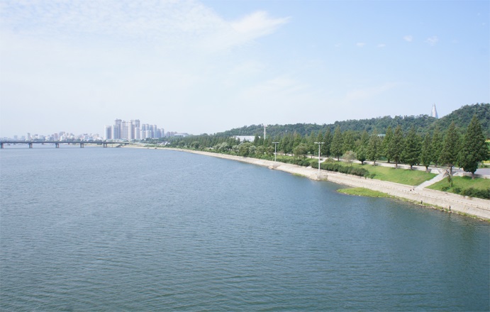 船がモラン峰*2のチョンリュビョク*3という絶壁を過ぎてオクリュ橋*4を近くにするとあっちこっちで楽しい一時を送る人々の姿が目に付きました。ボートに乗って楽しむ人たちの喜びの笑い声、きれいに整えられたプロムナードを散策するカップルたち、柳の木が垂れ下がる岸辺で釣を楽しむ人。