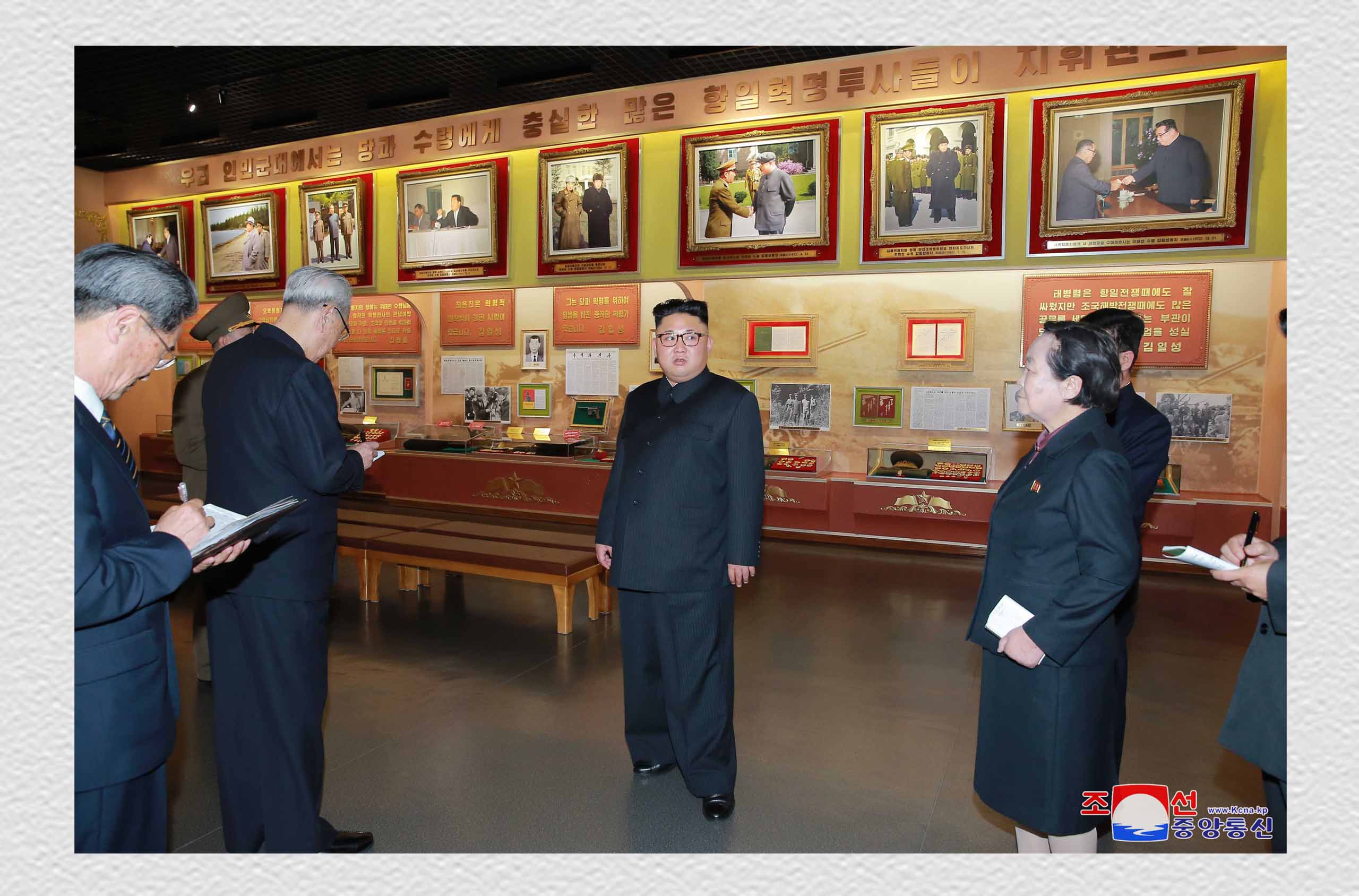 主席と総書記の写真と革命家たちの写真、縁のものに見入っていた金正恩委員長は、「金日成主席、金正日総書記と戦友」のコーナーに展示された写真の中の戦友たちは、みなが党と指導者のために生涯を捧げた同志だ、われわれは新しい世代も党と指導者に忠誠を尽くした前の世代のように生きるように教育しなければならないと言いました。そして「金日成主席、金正日総書記と戦友」のコーナーをまとめてより立派に作るよう教えました。