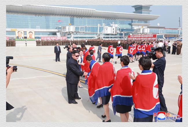 このように、選手たちが優勝できるよう色々と気を配った金正恩委員長は、帰国する選手たちを祝うため空港まで迎えに来たのです。国際競技で優勝した選手たちは共和国の尊厳と威容を誇り示した凱旋将軍も同じだと言って、深い恩情を向ける金正恩委員長です。