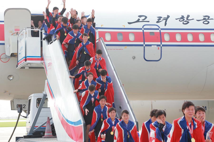チュチェ104(2015)年8月10日のことです。東アジアサッカー連盟女子東アジアカップ競技大会で優勝した共和国の代表チームが帰国しました。全ての試合を制して栄冠をつかんだ選手たちを市民総出で迎えました。
