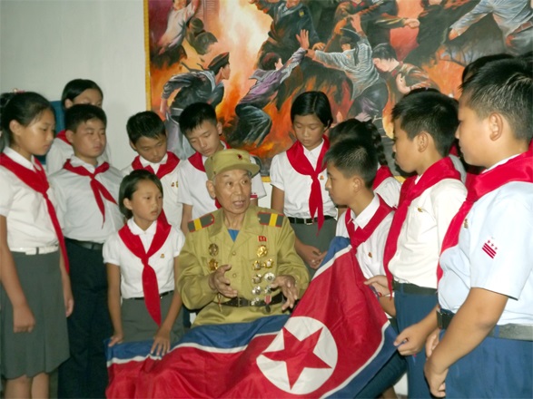 「砲煙弾雨の中でも揺るぎなくなびいていた共和国の旗が今も目の前に浮かんできます。戦友たちが敵弾に倒れるその瞬間まで手から離さなかった共和国の旗です。それが私たちの生活と幸せの全てである共和国を守ることになるからです。それで私は新しい世代に、命そのものの社会主義のこの国を守り、代を継いで輝かせなければならない、と言っています」