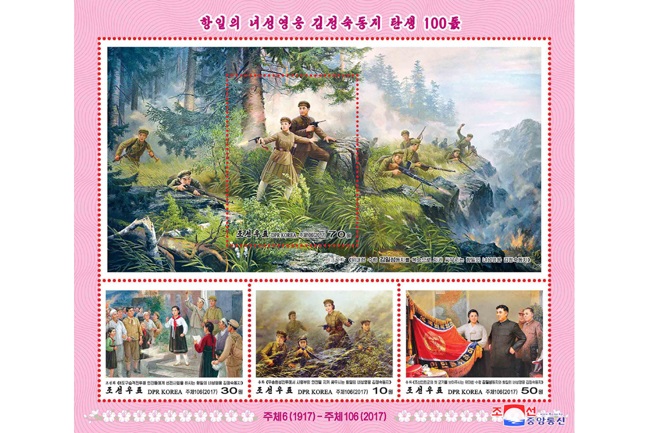 抗日の女性英雄金正淑女史の誕生100周年のブロックシート1種が出ました。切手の上の部分と下の部分に、「抗日の女性英雄金正淑女史の誕生100周年 チュチェ6年(1917)~チュチェ106年(2017)」という文字が書かれています。ブロックシートには、女史の不滅の業績を見せる美術作品がデザインされた切手が編集されています。