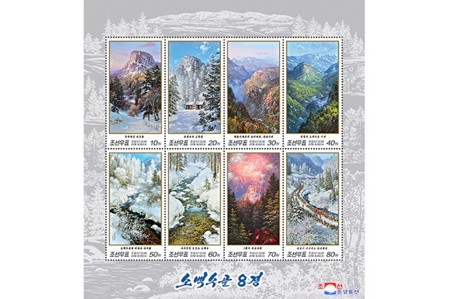 ブロックシートに小白水谷の八景である、「天下一番の正日峰」、「雪景色の中の生家」、「日の出の岩と竜馬の岩、長剣の岩」、「天険の地勢」、「小白水谷に咲いた樹氷の花」、「四季を問わず流れる小白水の水」、「二月の花火の夜景」、「引きも切らずに訪ねて来る人達」がデザインされています。