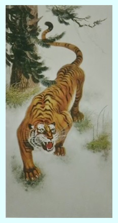 また張り詰めたように逆立つ毛と針のようにまっすぐ立てた白い眉毛、耳のほうに上がった目じり、力強く踏ん張っている足と鋭い爪、引き締まっている背中の筋肉、いっぱい持ち上げられた尾は怒り立つ虎の姿を際立たせています。