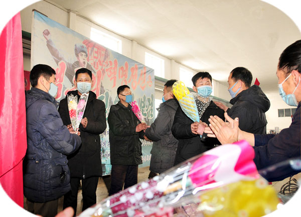この写真の主人公はピョンヤン・バス工場の模範的な労働者です。祝福の花束をもらって話し合っているこの人たちの顔から労働の甲斐と喜びを窺えます。