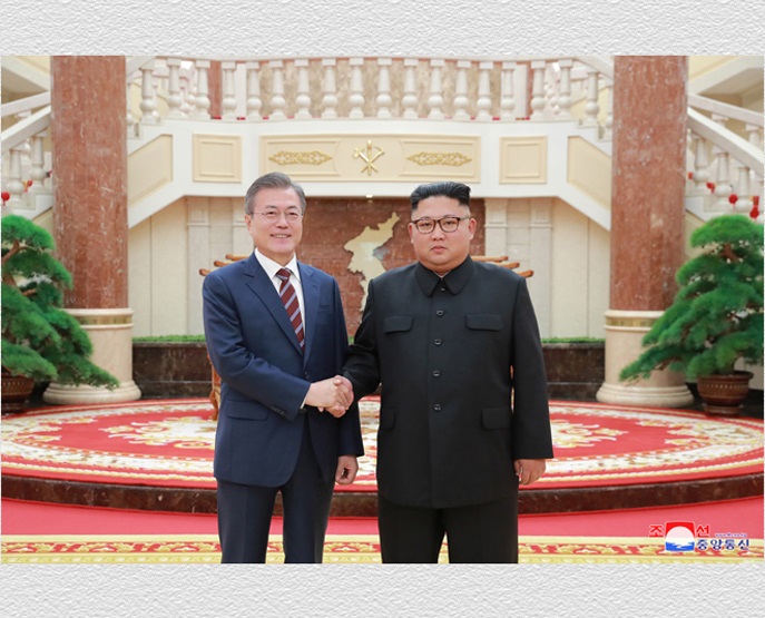 民族の和解と団結、平和・繁栄の新時代を必ず開くと言うその揺ぎ無い意志、卓越した指導と不眠不休の労苦によって、パンムンジョムで北と南の歴史的な首脳対面が実現し、自主統一の大綱領である4月27日宣言が採択されました。また9月には歴史的なピョンヤン首脳対面と会談が行われ、「9月ピョンヤン共同宣言」が採択されました。