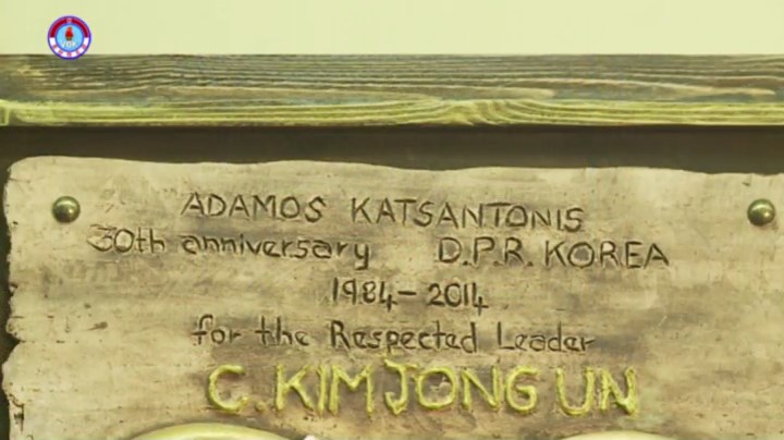 贈り物の上の部分の中心には「団長が訪朝して30年になる年に、敬愛する最高指導者金正恩委員長に贈り物を差し上げる」という内容の文が、右側の下の部分には製作者の名が英語で書かれています。