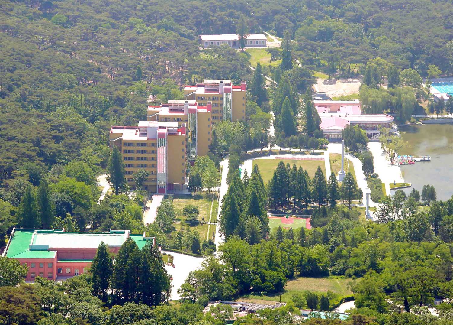 マンギョンデ少年団キャンプ場は60数年前に設立され、チュチェ105(2016)年に増改築されました。山並みとマッチして3棟の宿舎が、日当たりのよいところに南向きに建てられています。