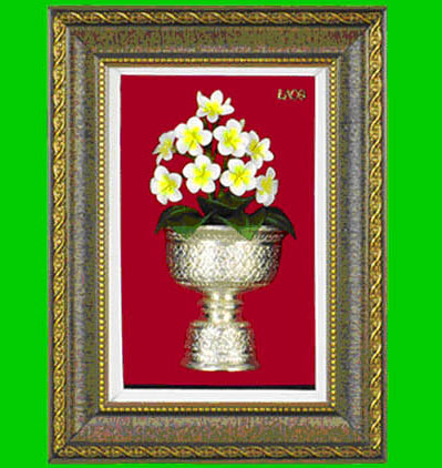 工芸はラオスの伝統的な器の一つである銀の鉢に、国花のチャンパの花を挿していることを表しています。
