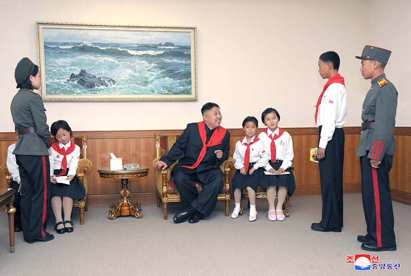 少年団代表と共にコンサートを鑑賞し、模範的な少年団員を身近に呼んでその希望についてもやさしく訊きました。一人の男生徒は大きくなって人民軍になると元気に答えました。
