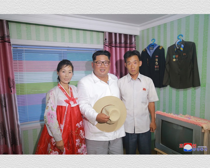 そして、除隊軍人夫婦が兵士時代の軍服を並んで掛けているのを見て、軍服は脱いでいるが、兵士時代の精神で生きているようだ、労働党が気を使い、一番重視する持ち場で愛国の玉の汗を流していることをありがたく思う、と言いました。また、仕事と生活でいつも模範になるべきだ、家庭の幸せを祈ると言い、共に記念写真を撮りました。